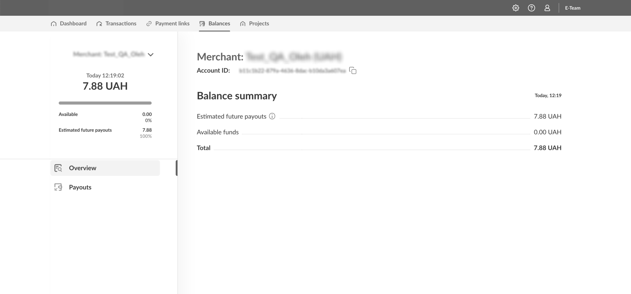 In the Overview tab on the balances page, you can view your current account balance, including the amount currently available for settlement and the amount in the clearing stage (undergoing reconciliation) that will be included in the next settlement.