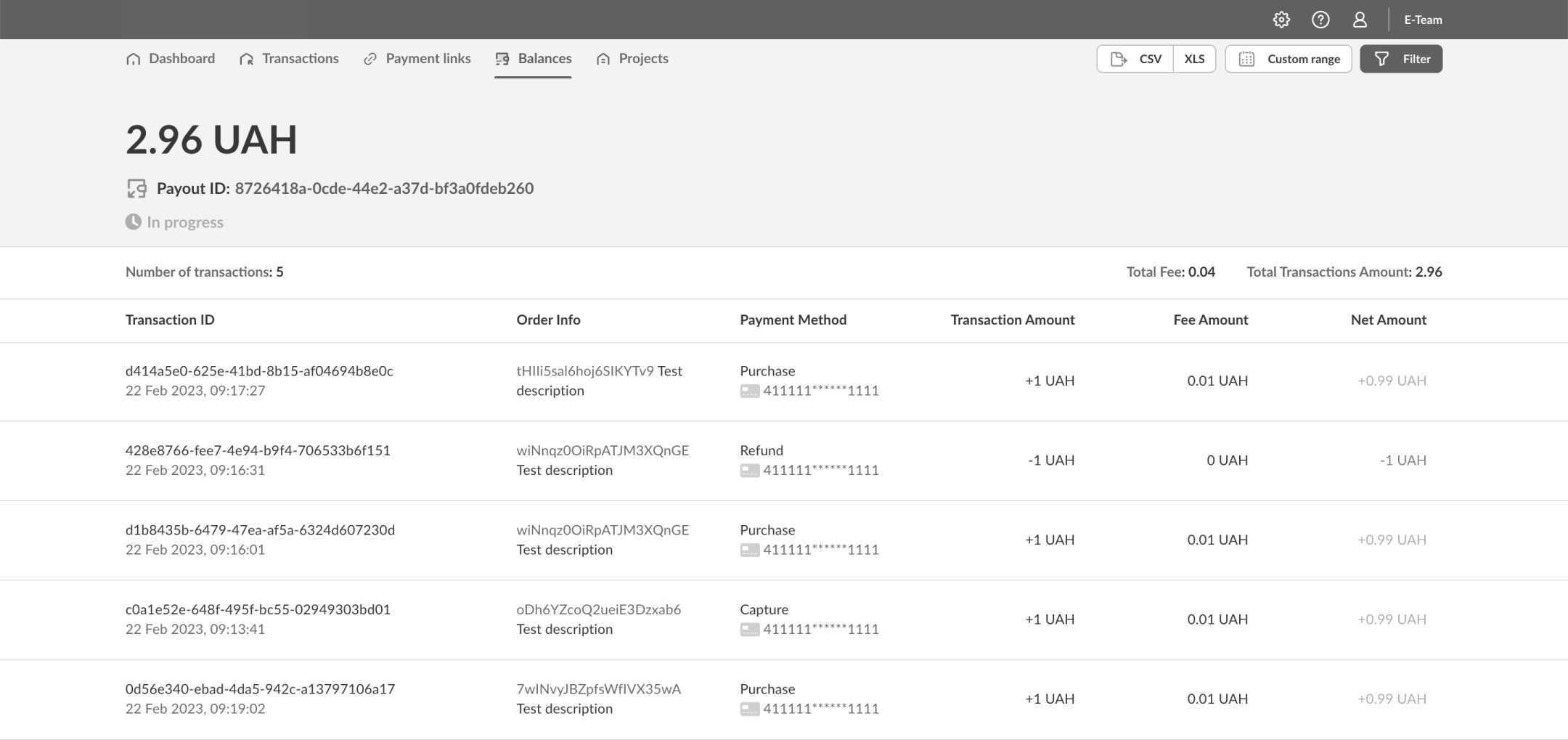 In the Payouts tab, you can see the settlements made from your account in our system to your bank account. The following data are displayed for each payment record:
