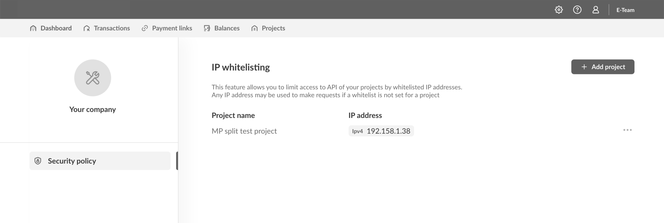 This page is for setting global security settings for the merchant account, meaning these changes will affect all users. Currently, you can set a list of IP addresses from which requests to the Settlix API for your projects can be made (IP whitelisting). This allows you to restrict the ability to send requests from third-party IP addresses not specified in the configuration.